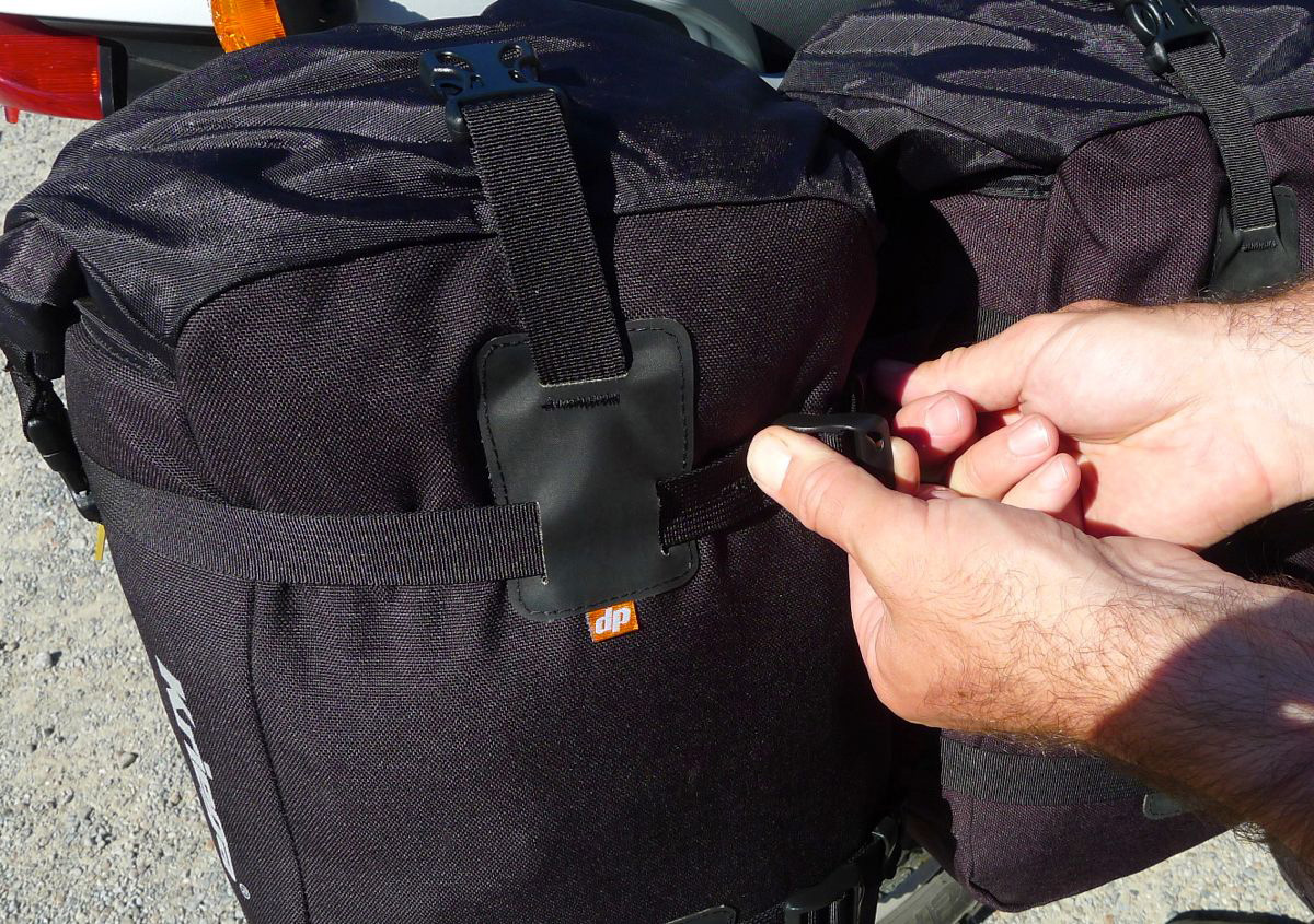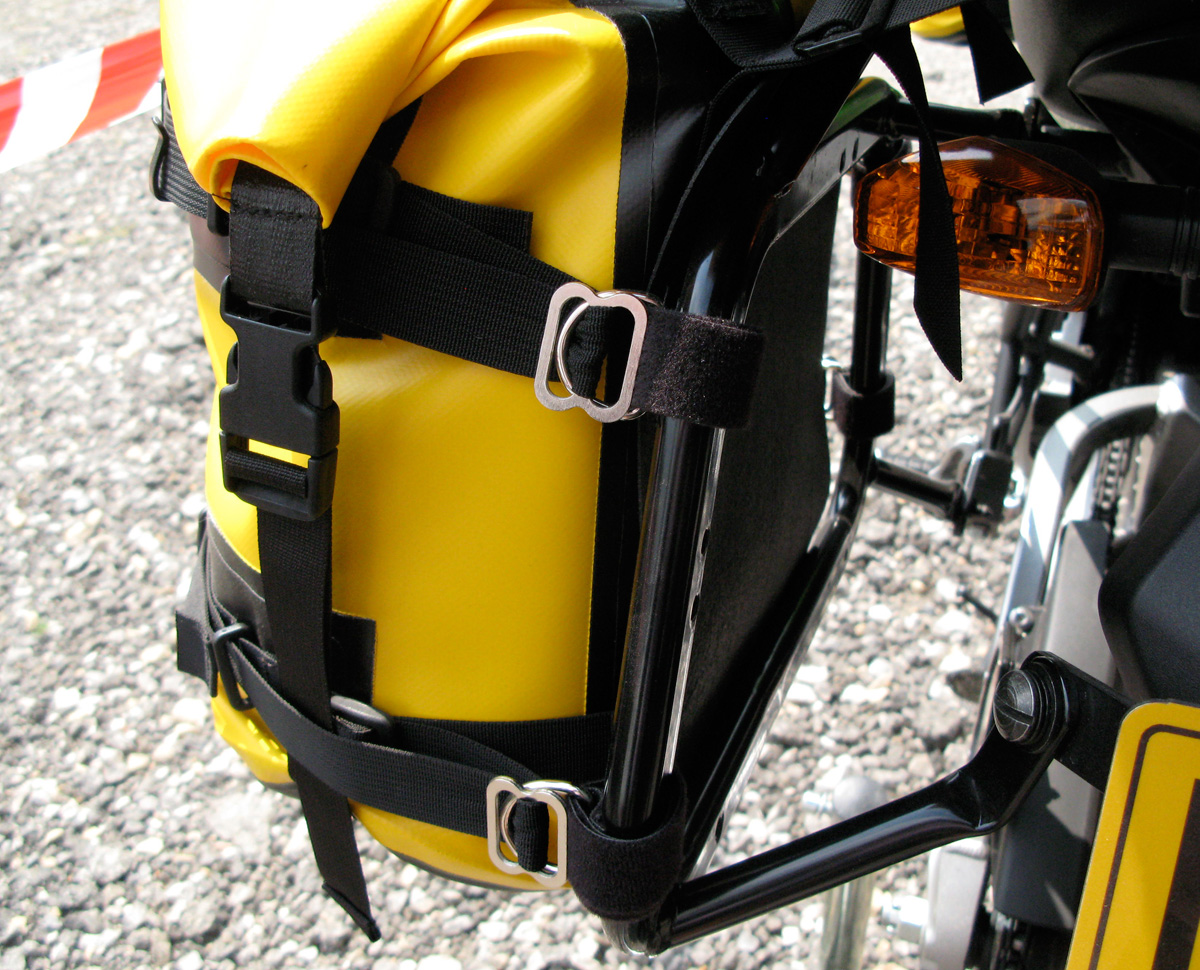 To stop the bags sliding back you get a strap to attach to the pillion footrest or thereabouts (left), as on the Monsoons but something that was missing from the Magadans’ first version. Subsequent versions low have a tie-off D-ring.