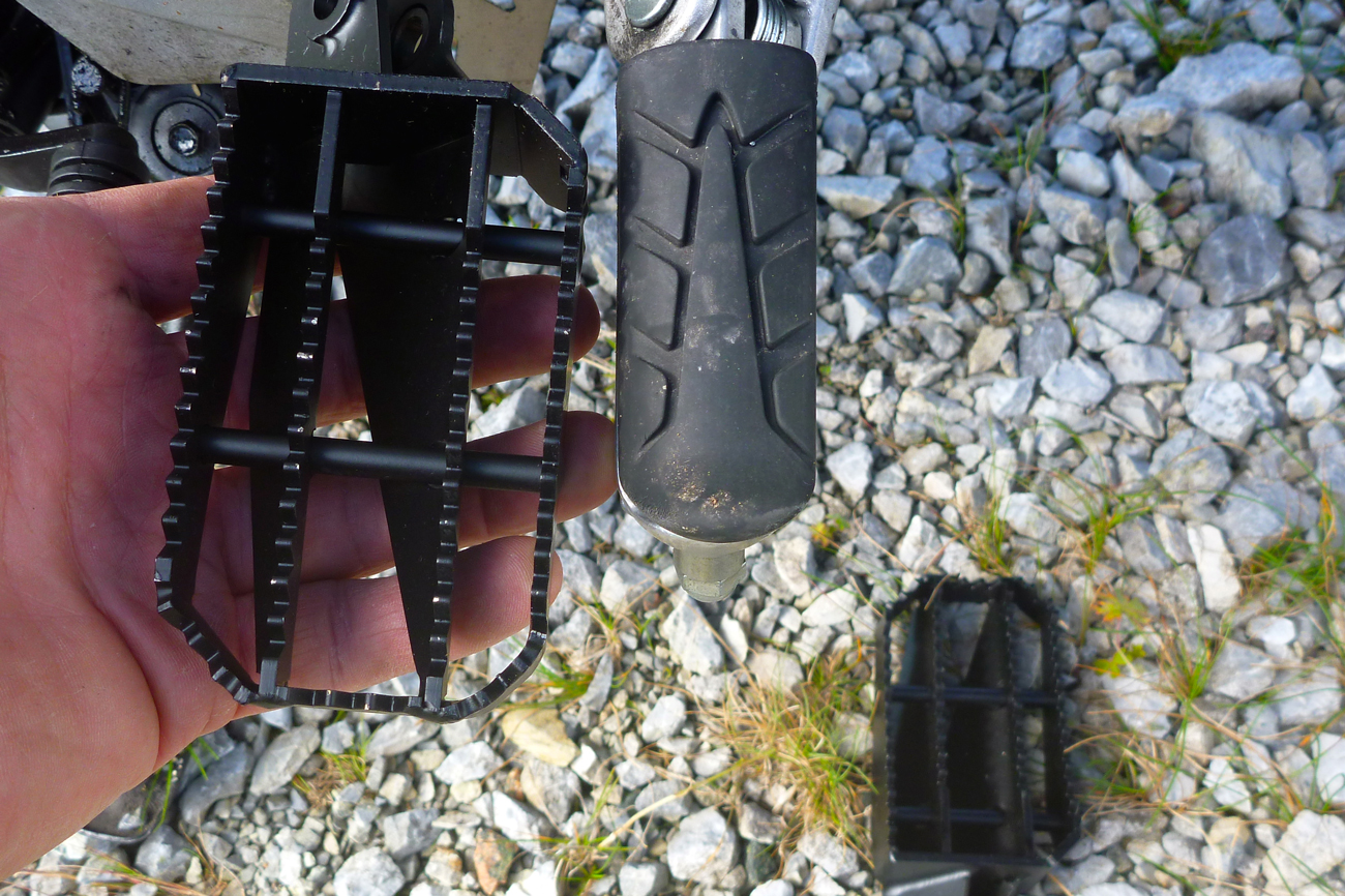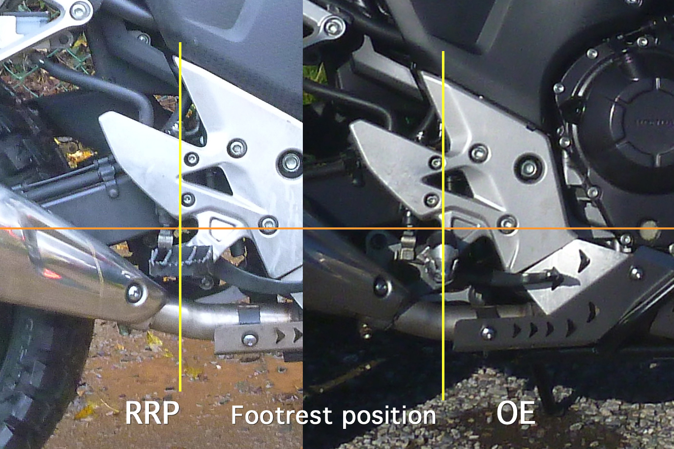 One good thing is the RRP platform footrests (left) feel up to an inch lower than the rubber-capped OEs which makes less of a leg bend and also standing up less effort. Turns out they’re a bit further back too (see image, right).