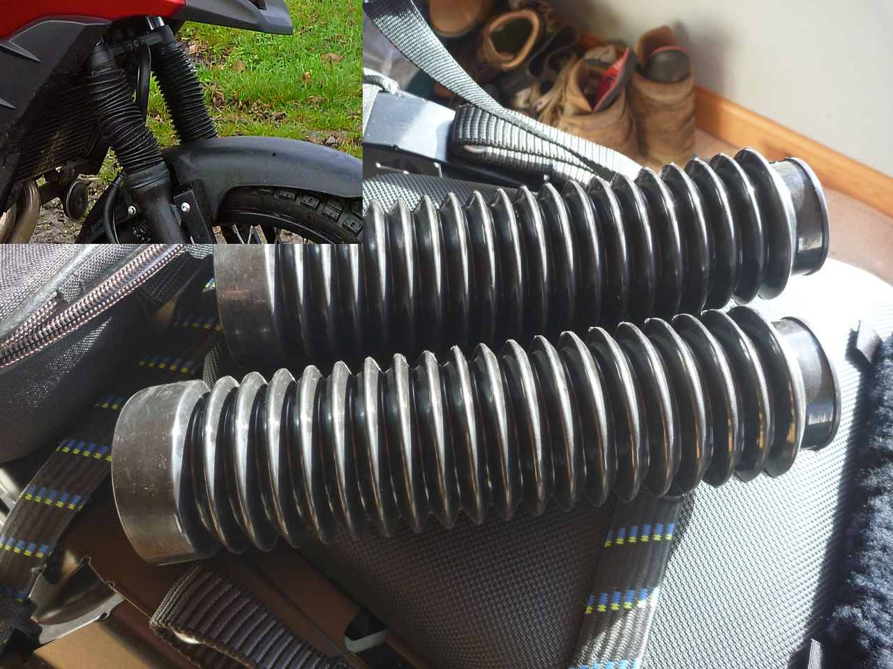 I also noticed one gaiter looked like it had ‘vacuumed in’ as if there was no breather hole and the pumping action had sucked it against the forks. This would cause stiction, and I recall Bas at HP telling me that eliminating stiction (drag) contributes greatly to smooth fork action. When I snipped the zip tie prior to cutting the whole thing off the tension was released. Looks like it was merely mounted with a small twist. Now it’s zip-tied back up and might help improve the fork action.