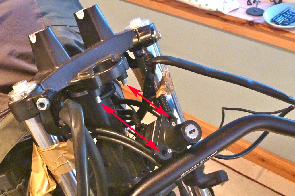 Removing the ignition barrel from the OE top clamp is where things slowed down. First, two crosshead screws holding on the HISS ring needed undoing from underneath. Why crossheads FFS? I almost lifted the bike off the ground getting the pressure in there – luckily they both turned with a nice crack of shearing Loctite. Later John advised these are actually JIS head screws – some sort of Japanese standard that’s possibly better than Phillips. Could that be why we had all that trouble using Phillips drivers on Jap monkey metal crossheads in the bad old days? Probably not.