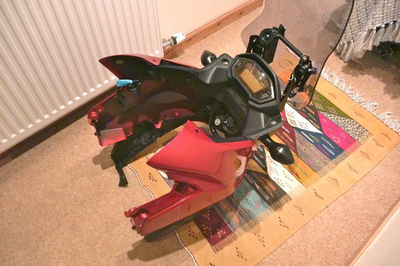 Removing the whole headlight/fairing/dash unit (left) is actually quite simple once you get your head around it. The pdf instructions from RRP are all clear – all the more so when you look back at them. Side panels off then three screws on each side of the fairing and then the crucial double 12-mil bolts on the steering head which take all the weight. Ease back the LHS to unplug a couple of connector blocks and away it comes. RRP include some alternative 12 mils with nylocs in the kit. I saved them for later and a 1000 miles down the road, when I got to their workshop one had fallen out. RTFpdf.