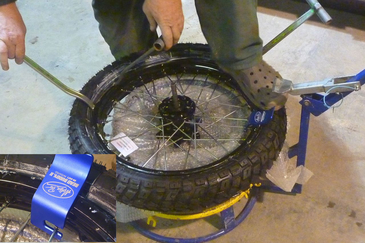 Heidenau K60 19-er leftover from my old GS500 project went onto the front rim with no hassle. I got a chance to try out my Motion Pro Bead Buddy II (left, blue), a ‘hands-free’ clamp that forces the bead down in the well when levering on the opposite side. It’s the same as putting your weight on the tyre to push it down (not so easy on the tyre rack, left) and it did the job.