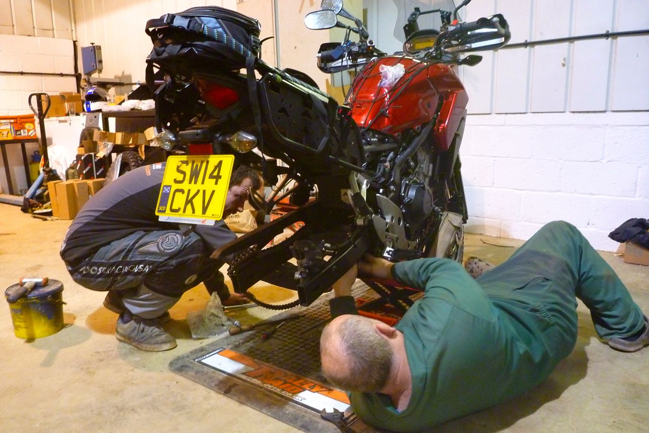 A few days later at John’s workshop near Bedford wheels and suspension were needed to finish the Level 3 job. I’m trying out some RRP wheels sealed with a mystery polymer by BARtubeless in Italy to run tyres tubeless. With his rally racing background John’s more of a tube or mousse man. For less aggressive solo travels to which the CB-X is more suited, I err towards tubeless and gel, as do a few other potential RRP customers. RRP may end up being the UK supplier for BARTubeless.