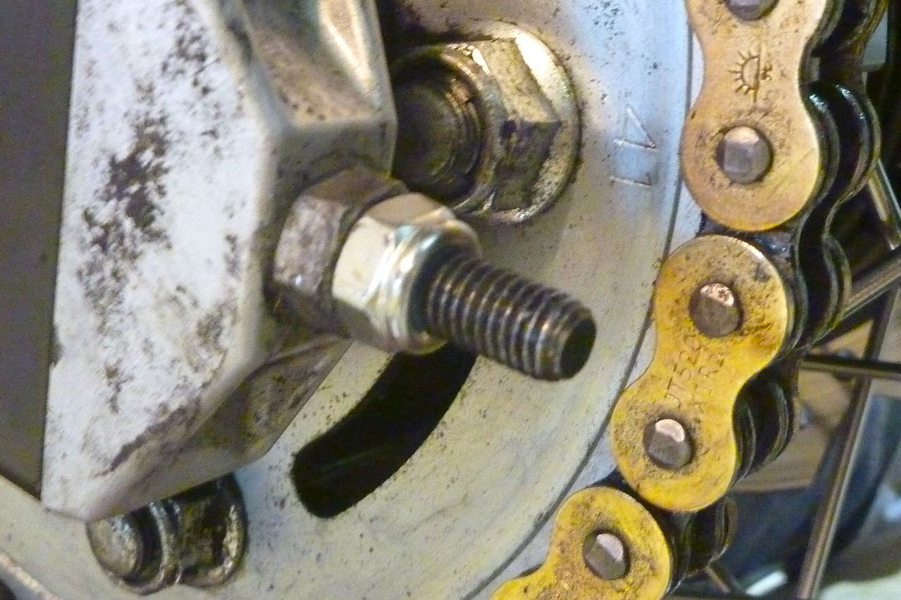 One problem with them is the thick layer of polymer in the well of the rear rim making tyre mounting difficult. That’s what they found earlier fitting a Golden Tyre GT 201 (left; 150 / 70 R 17 TL 69V) I bought from Adv Spec. You need the depth in the rim’s well to give enough slack in the bead when doing that last bit of levering. Of course, some tyres are harder to mount than others and the GT201 (a K60/MT60 look-alike) is stiffer than the TKC which RRP typically use. While in the area they adjusted my recently bedded-in x-ring chain and John recommended fitting a nyloc nut on the chain adjuster bolt (right); apparently the OE nuts fall off.