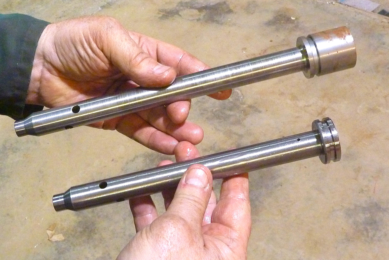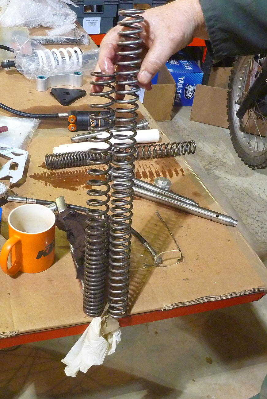 The forks came out, got cleaned up and the internals were all replaced. John showed me the Honda ‘progressive’ spring which is really a ‘twin rate’ coil off something shorter with a tacky white plastic spacer to elongate it for the CB-X (visible back left). John replaces it with a full length linear spring from Tractive (left) and tackles the progressive response with a 30mm-longer damper rod (right) using some clever deforming shims as well as some much lighter fork oil that’s less prone to losing viscosity when hot. On top, the forks get pre-load adjusters (as will 2016 CB500Xs)  and air bleeders.