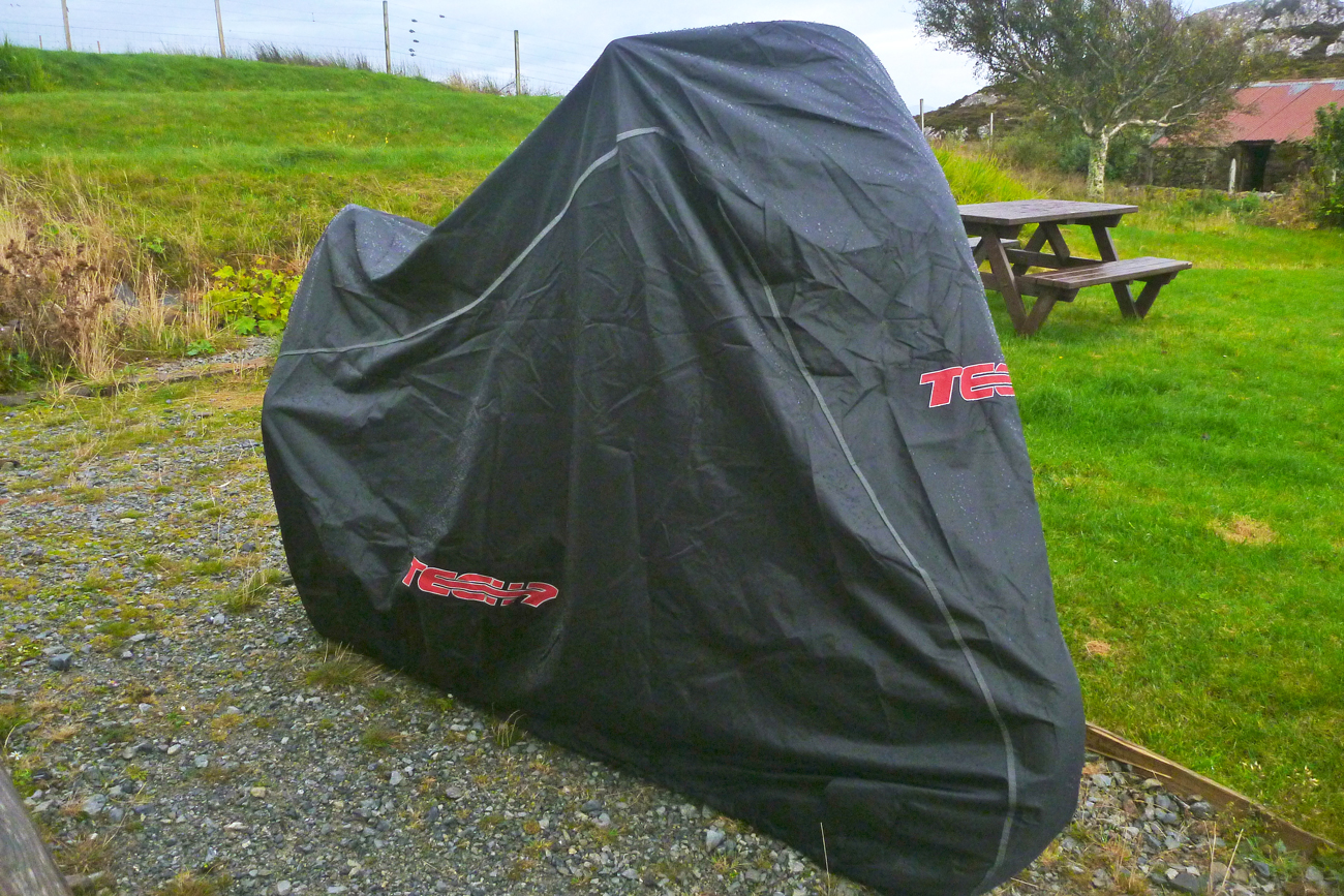 BTW, let me put in a good word for the big Tech 7 Adventure Bike cover. Yes, there is such a thing, and it fits bikes up to tall screened GS12s and S10s. Still only £23 from M&P, I’m sure it’s much tougher than those £10, last-a-year silver jobbies, has two under straps just inside each wheel, but also has an elastic bottom to make those straps unnecessary unless it’s very windy.  Low-profile black to reduce visibility on dark streets and compact enough to make a handy travel cover or groundsheet.