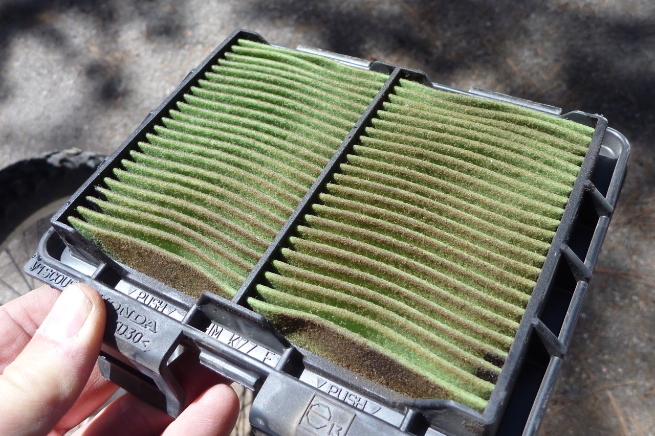 Once I understood all this I went back to first three green lights flashing in Mode live, and pressed minus until it was flashing green between lights 1 and 2 which equates to 1.5 as Dobeck suggested. Press Mode again and the same setting change for yellow (orangey-red) mode. And then Mode again for the big drop from wide open red (which I rarely use) from 6 to 2.5. As mentioned, Dobeck recommended not changing the three rpm switch points so that was it. Once understood it took less than a minute. After cleaning out the dusty air box and greasing the inner surfaces to catch dust before it got to the element (below left), I taped up the six 1-inch holes on the air box side lid and went for a run.