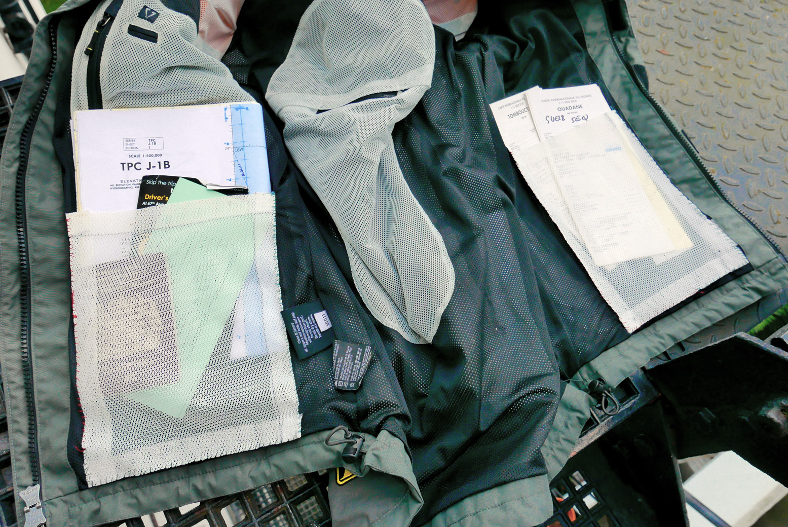 Inside the main shell are two smaller, lighter-load-bearing but deluge-secure wallet-and-phone chest pockets: one vertical entry, the other from the side, both velcro’d; take your pick. You can also velcro on a clear, zip-up pocket onto the left forearm; handy for a compass away from metal influences, I find. I use all of them plus a light, bladder-holding daypack so when I get off the bike I know I have all my compact V&FUs with me.