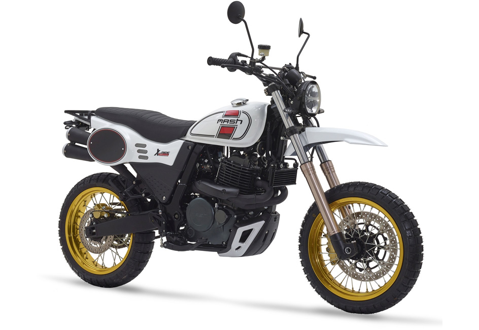 For a while there was a bike I was curious about: the French-branded, Chinese-made Mash Adventure 400 (left) that was briefly available in France and the UK alongside other 400s. It was near identical to the similarly short-lived WK Trail 400 mentioned here. Both use the same Shineray XY 400 engine from Mash’s Roadstar retro. In the UK you could pick up low-mileage WKs from £2500 and end-of-line Mash Advs were going new from £4750, complete with panniers.