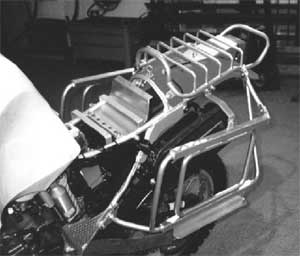 When using a rigid container like an alloy box there’s no need to have a full-width shelf; an inch-wide ledge will support a metal box, as it did on our Desert Riders XRL racks (below). The welding was superb but that rack was over-built, slapping metal over metal in search of strength but actually blinding the function by adding excessive weight. We did carry very heavy loads at times (left), but two of the XRLs cracked their subframes.
