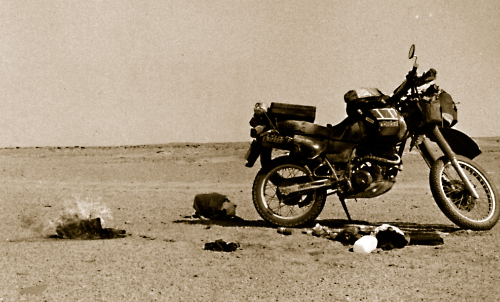 On the next couple of trips I used no rack. People do manage – usually on smaller bikes with lighter loads – but for overland travel, classic, strap-over throwovers are a throwback to a twin-shock era. The problem is usually with the high pipe of a trail bike. The bag presses on the panel which melts and – on a hot day on the south side of the Sahara (below) – the plastic catches fire soon followed by the ex-army canvas panniers and your favourite pyjamas.