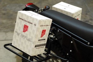 Platform racks have been around for years, among other places used on army BSAs in the 50s and 60s (left). I’ve always liked the principle but these tinny, hinged trays were designed to take a specific panniers or to swivel up out of the way when not in use. It’s a logical and effective form of support. Within limits you can securely load anything on there; box, bag, sickly calf, bulging sack, except the sliding support arms get in the way of bigger loads.