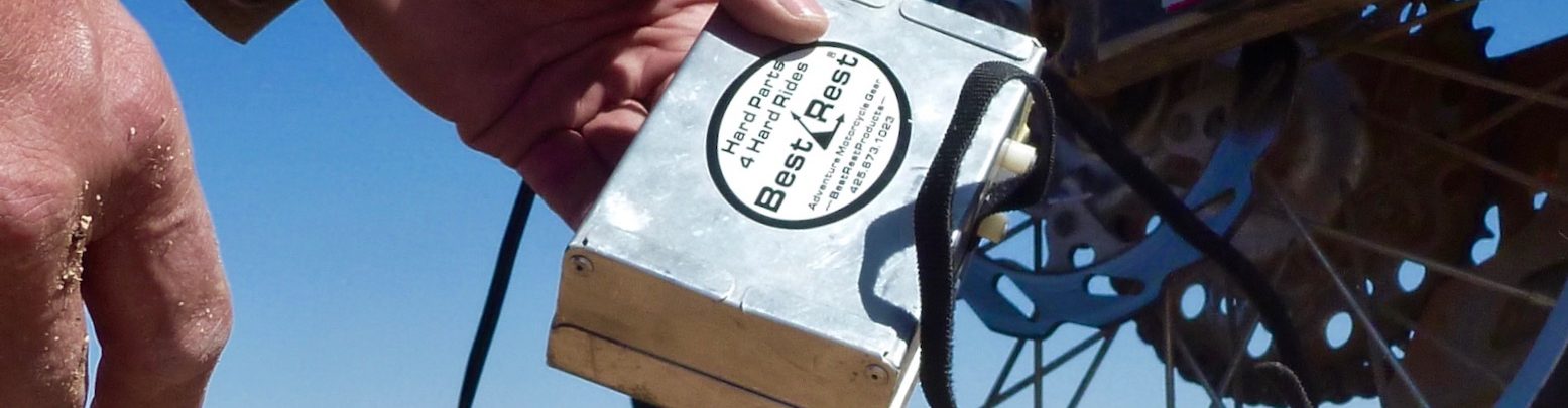 I had similar racks made for the Sahara, but using soft bags (below), but you can’t help worrying about that hard front edge on your lower legs. This never occurred to me until Desert Riders when we added big metal boxes to remind us how they might hurt.