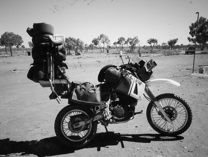 On the next couple of trips I used no rack. People do manage – usually on smaller bikes with lighter loads – but for overland travel, classic, strap-over throwovers are a throwback to a twin-shock era. The problem is usually with the high pipe of a trail bike. The bag presses on the panel which melts and – on a hot day on the south side of the Sahara (below) – the plastic catches fire soon followed by the ex-army canvas panniers and your favourite pyjamas.