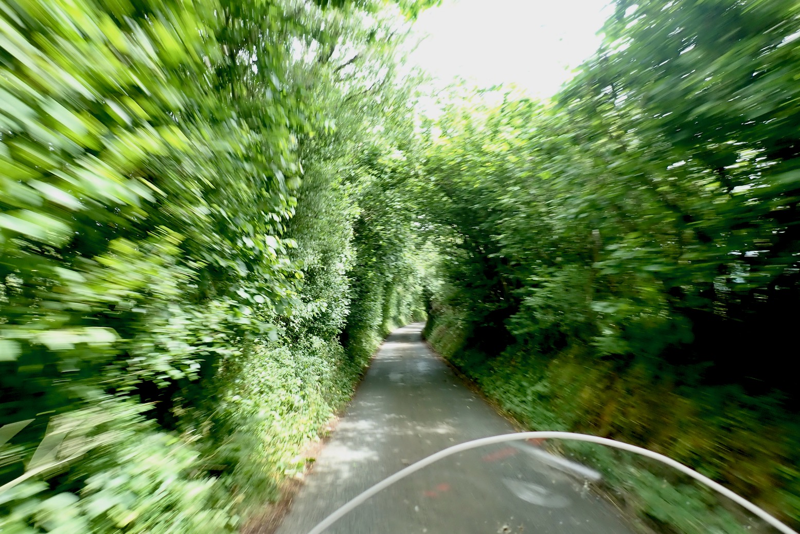 Walled in by lush summer hedgerows, a narrow country lane turned to gravel which led into a forest. Is this a rideable trail I wondered? Why no prohibition signs or locked gates?