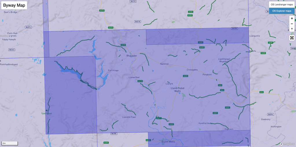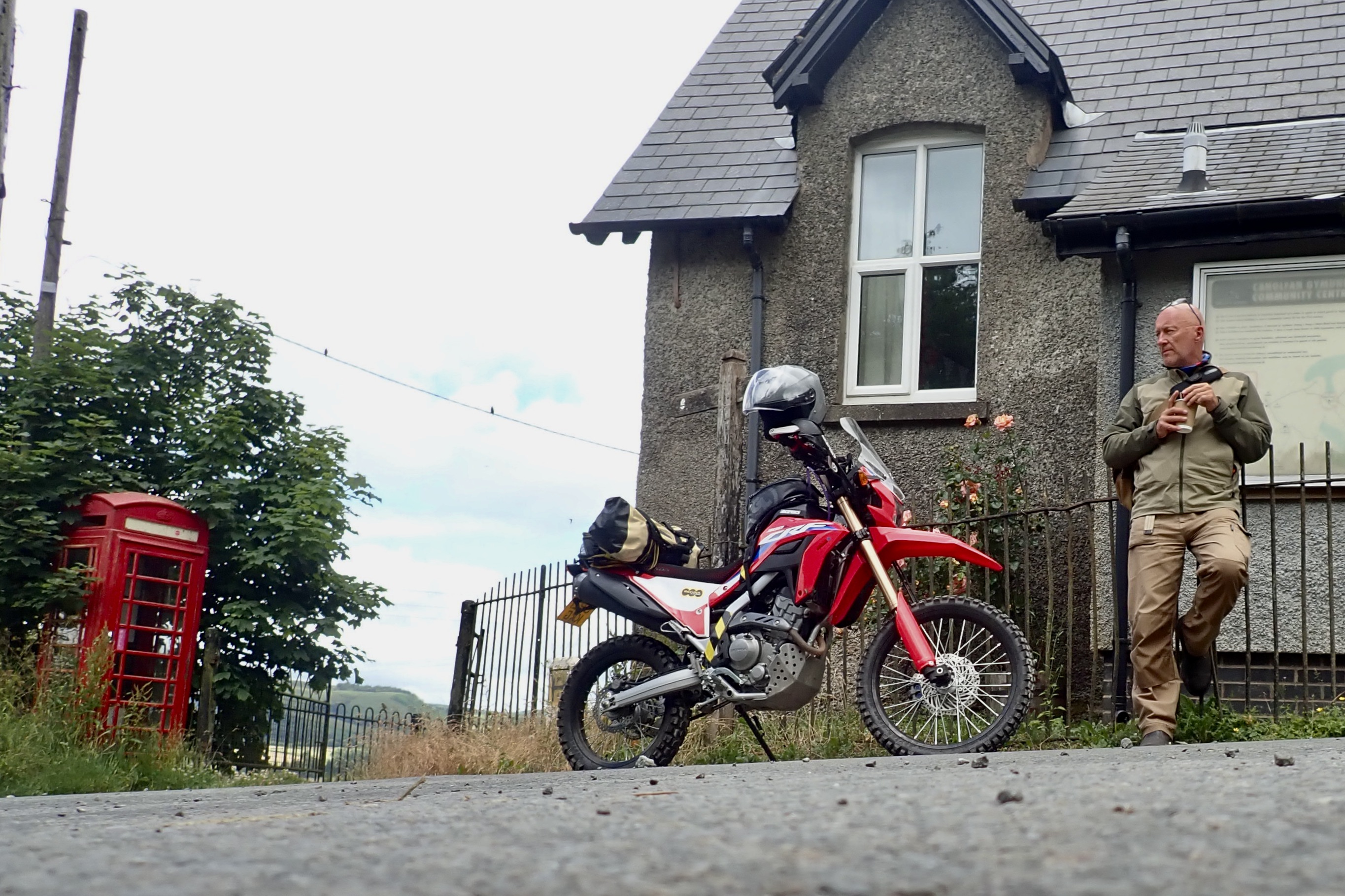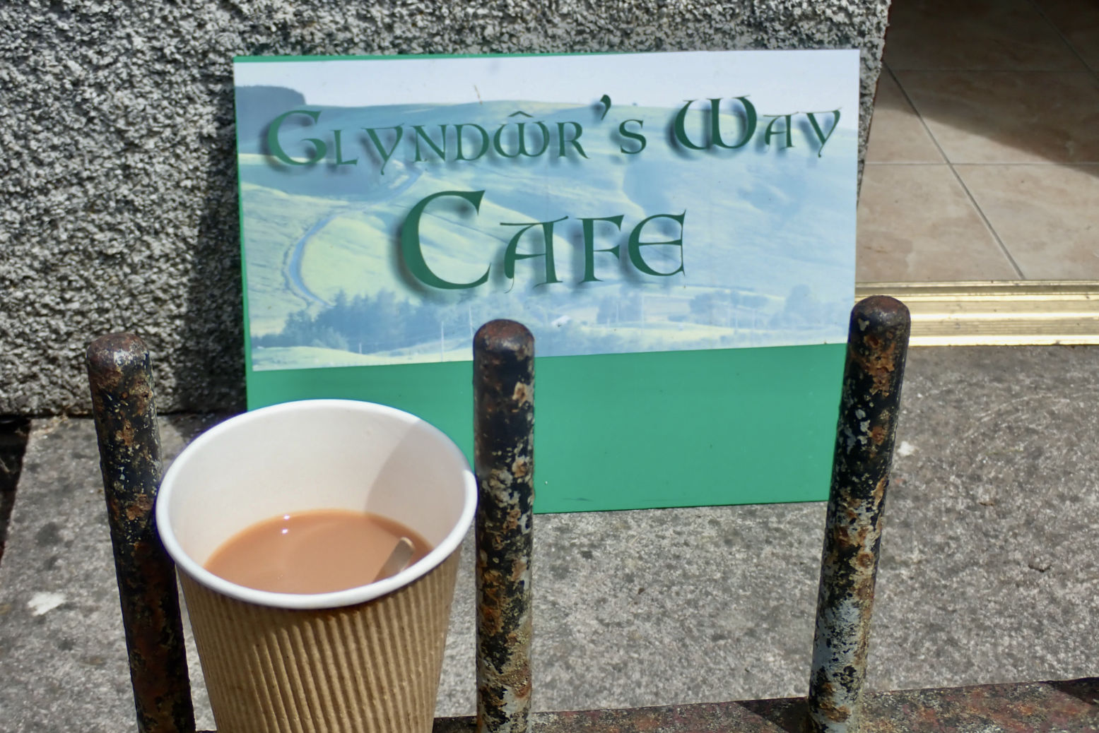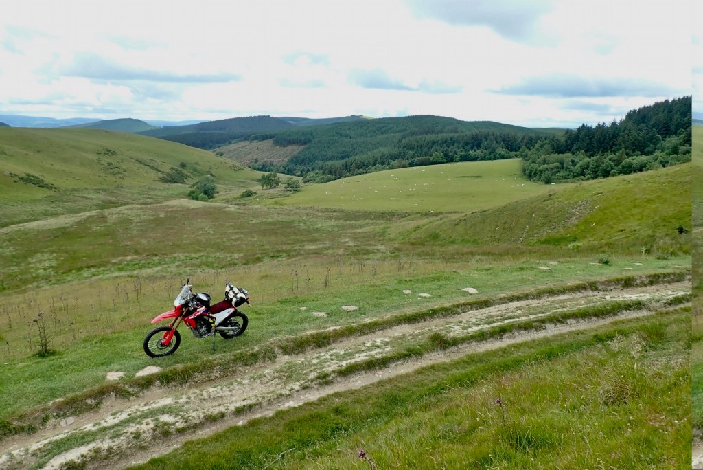 My Garmin is loaded with OS mapping which showed this was not* a green lane (‘BOAT’, etc). But it led less than two miles to Bwlch y Sarnau on the Glyn’ Way, a deserted hamlet at over 1000 feet whose name evoked pre-Christian Wales and where there was a self-service ‘porch cafe’. It also saved a long diversion, so unexpectedly I found myself outlaw off-roading in mid-Wales. How thrilling! There were a few MTB tyre imprints in the earth but nothing from a moto. Doing this is bad form and not something I’d knowingly do again, but in just a few minutes I reached Bwlch via a couple of gates. There was no one around, same as last year walking and pushbiking in this area.