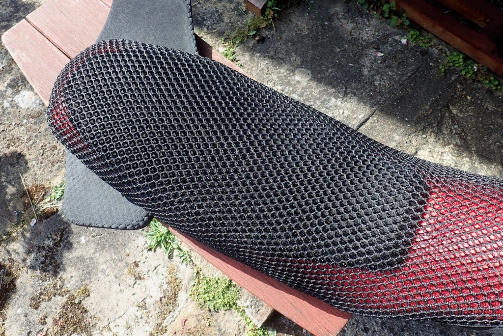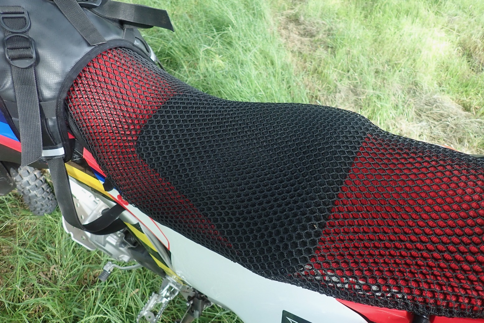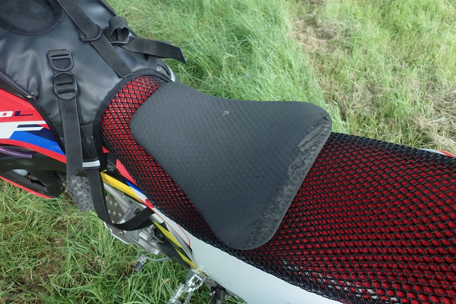 It made me wonder do you want a grippy seat surface or not? I do notice grippy seat covers for trail bikes on ebay. It must be related to riding – active off-roading or low-energy road touring plus what you’re wearing too; how close a fit and the fabric’s own grippiness. With my baggy cotton cargo pants, the Cool Cover is slippery which can cause friction, but sat directly on the neoprene pad back from Wales, the grip was massive and I slide around inside my trousers which was as bad. I do seem to recall leather trousers which I wore for years helped prolong comfort, whether down to good grip on seat vinyl or the close fit.