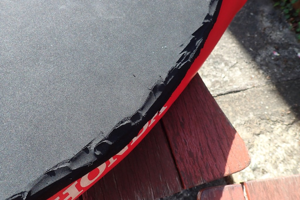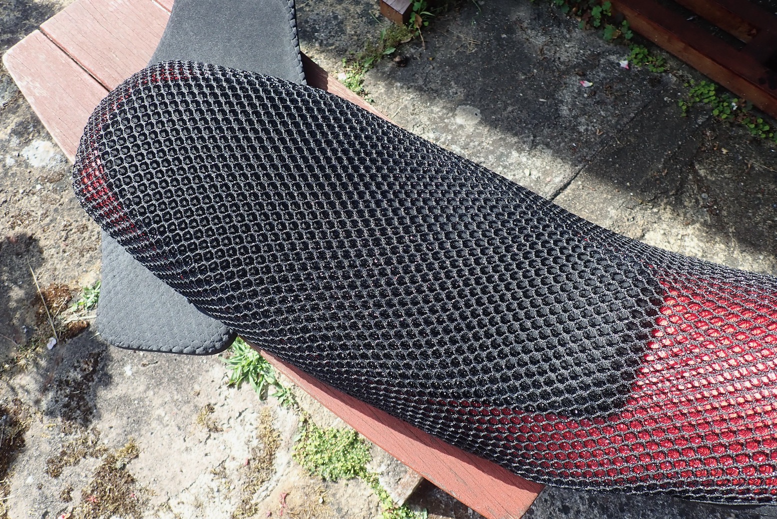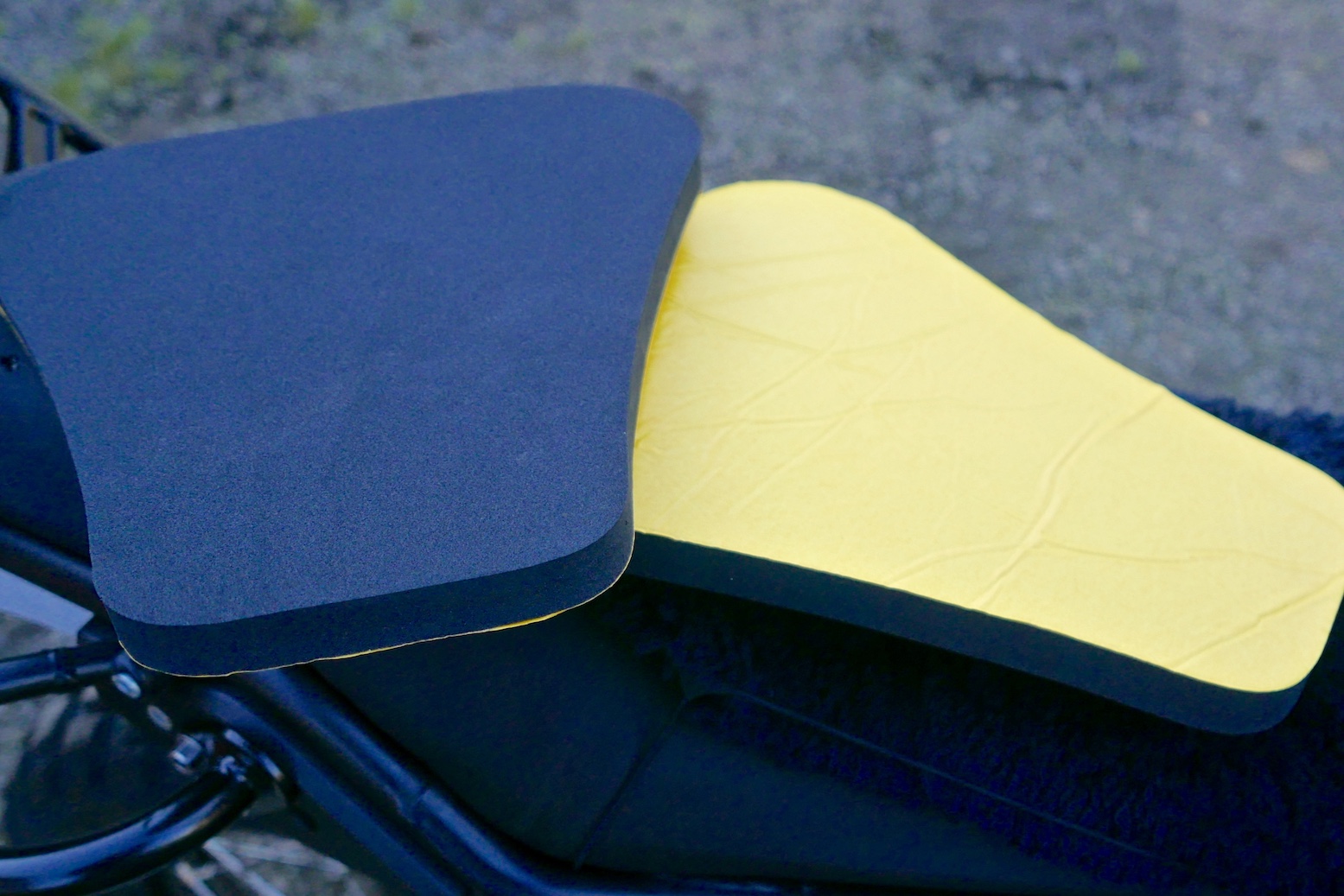 Heading home with the neoprene underneath the Cover, the saddle was levelled off and I slid about less on deceleration. It was all round a big improved on the sore morning’s ride and a few days after I got home I trimmed the two pieces of foam to fit the 300L’s seat, glued them together and fitted them under the Cool Cover. The seat is now about 35″ (890mm), 14mm more than before (half being the airy Cool Cover mesh) but a whole lot more comfortable. See more bottom of the page.
