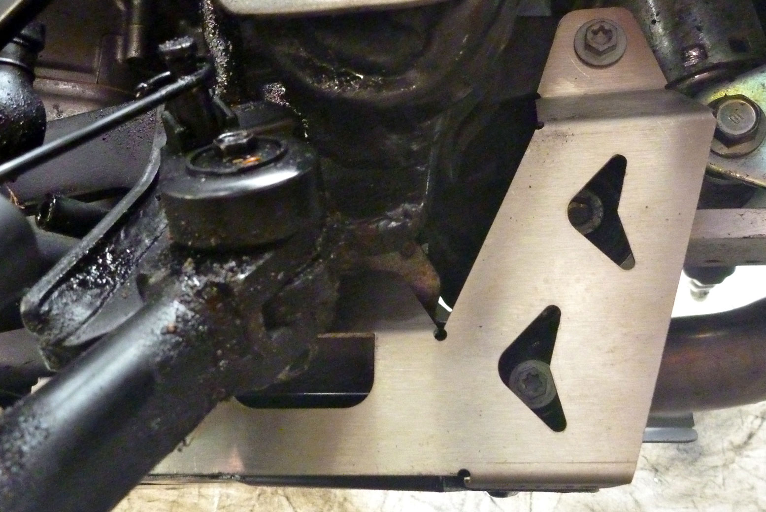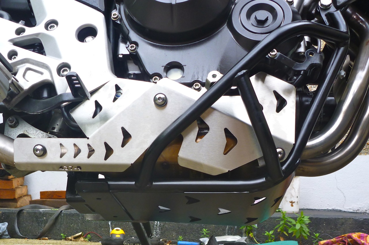 The RR skid plate / crash bar has lately been used as a surrogate prop in place of the side stand, and while it’s taken a few flying hits, I don’t recall bottoming out on anything big. It’s doing its vital job unobtrusively.
