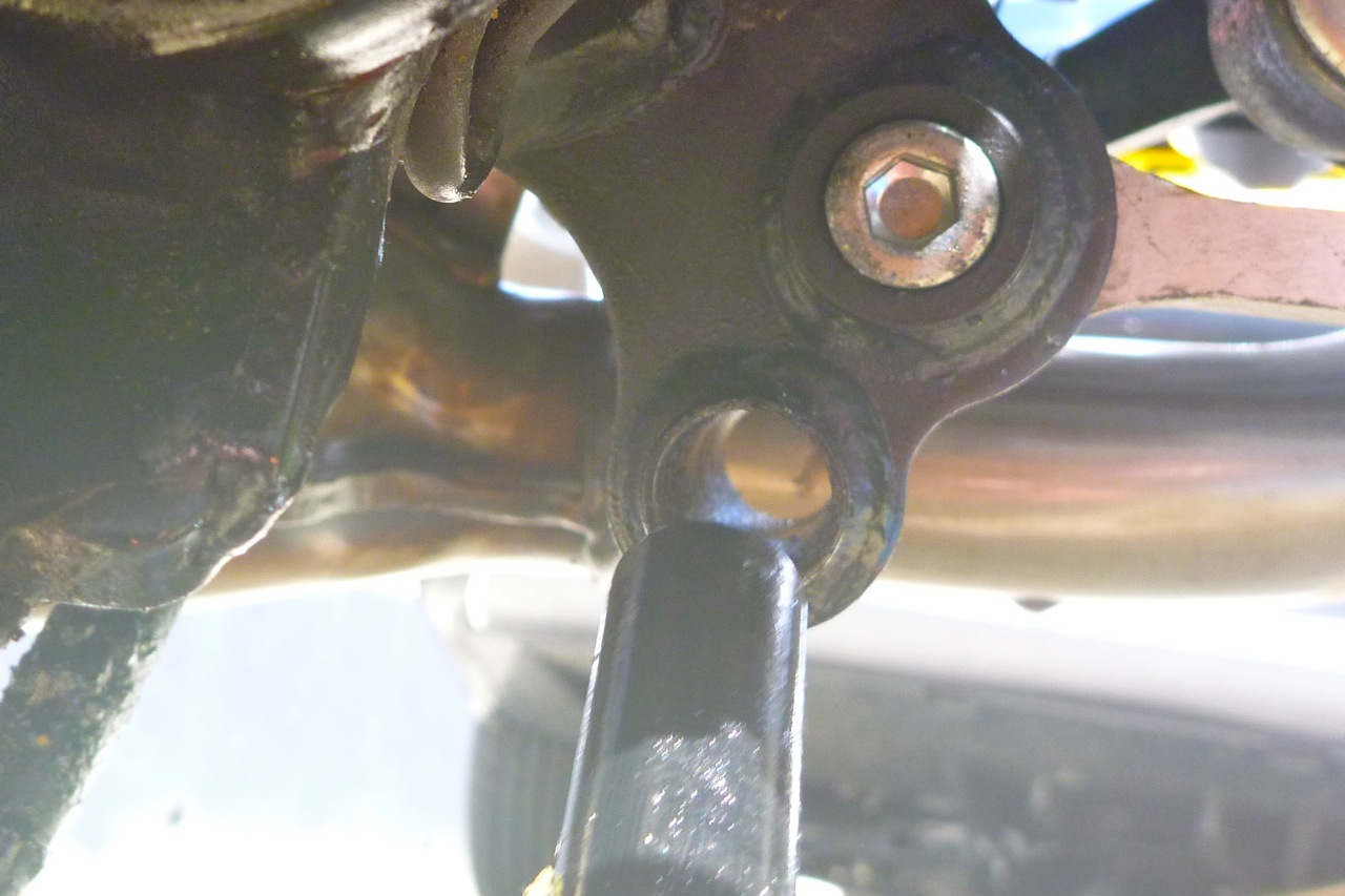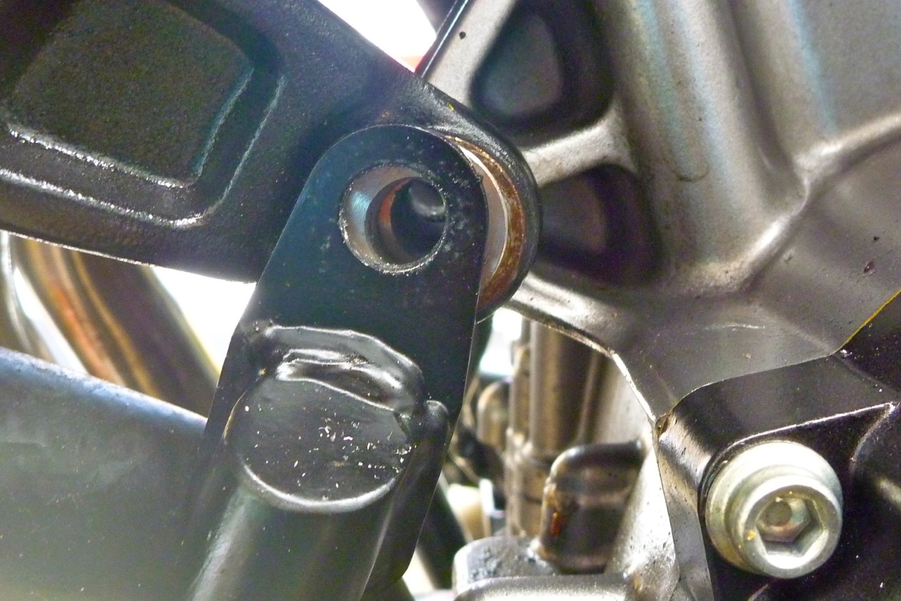 Closer inspection showed the bend was not on the Honda frame tab but just below the stand’s pivot (above). The RR stand is made of flattened, not round tube, and the alignment of the flat face is right into the bending force. Checking my earlier pictures, it looks like the OE stand shares the same flattened profile (i.e.: not round tube), so it must simply be down to greater leverage on the new stand due to the added length.