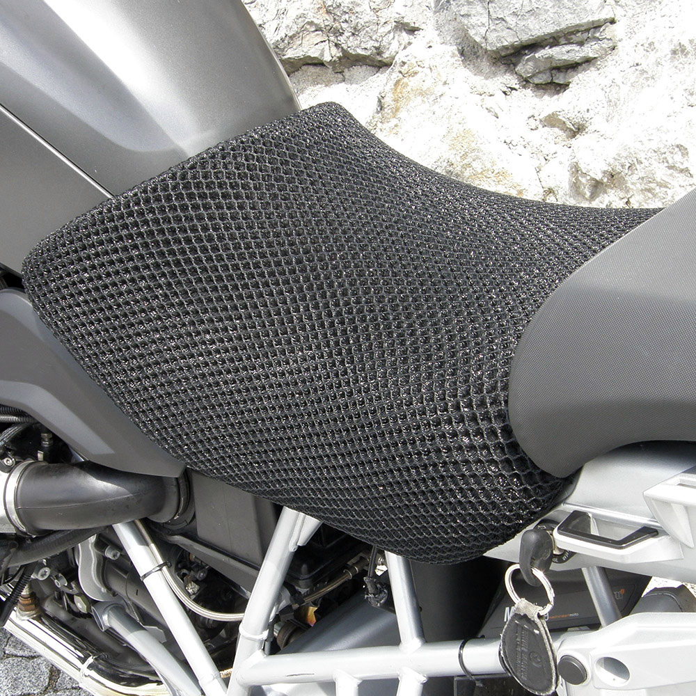 I’m getting a mesh Cool Cover to test. One good thing with fitted covers like this, as opposed to airbag seat bags, is that you can securely stuff added padding underneath without having to do a reupholstery job. I’ve got an old Aerostich lambs wool seatpad (left) which used alone may have had its day, but under the Cool Cover may add a bit more cushioning. One good thing on the REH is the two-part seat; it makes any foam-hacking job a bit less terminal.