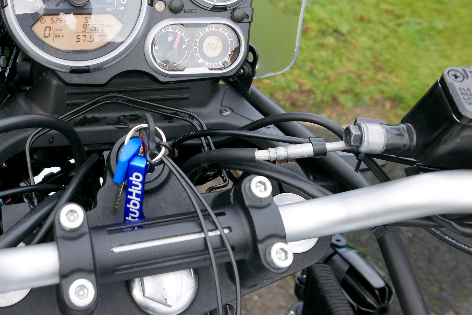 Talking of which, with this ABS model (brake line goes under tank to the pump, not straight down to the wheel) I’m not sure there’s enough slack to get much more than an inch of lift on the bars, which means my 50mm Rox Risers may have to sit this one out (they didn’t). Non-ABS Hims ought not have this problem. As it is the stoop for me isn’t too bad and the general position is of course much better than the XSR. I only tend to stand when I must, but that’s partly because I rarely ride a bike where prolonged standing off road is comfortable. One way to dodge the stoop is to lower my height by removing footpeg rubbers. Wearing very thin socks also helps. Fyi: ABS switch hack.