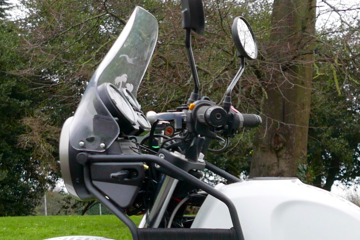 The screen is better than nothing and has a tiny bit of fore and aft adjustment. It’ll be all that’s needed off-road; less so for a long cross-country ride. You can get those clip- or bolt-on deflectors like the adjustable MRA Xcreen (below right) which I had on a recent Tiger (we don’t talk about that bike) and which worked well for what it was. Or Hitchcocks Enfield specialists do a taller version, but only by 60cm. Changing a fixed screen is a gamble while others have found chopping it right down greatly reduces buffeting. Much depends on your helmet, height and attitude to discomfort. You’ll never get it right all the time and it’s all part of the biking experience, so unless you know what works for you, by far the best screen is something adjustable like the Xcreen or the Palmer I had on the CB-X.