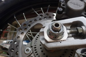 While readjusting the cleaned-up chain, I took a moment to lament the passing of footproof snail cam adjusters, I bet there’s a way of retro fitting them to fiddly lock-nut adjusters. And is it me, or is the swingarm alignment marker maddeningly on the wrong, underside of the axle? I can’t bend like I used to could so had to lie flat on the ground, which means getting all the way up again. One… two… three… Ooof!