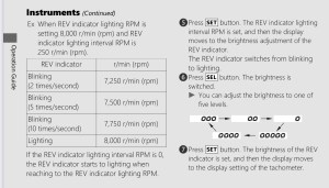 I’d never heard off the annoying white light in the console which starts flashing ever faster as you pass 7000rpm. The red line is another 3500rpm away, so what’s the point of it? To warn you to change gear or you’re going too fast? Whatever, it seems it can be adjusted up the rev scale and out of the way (left).