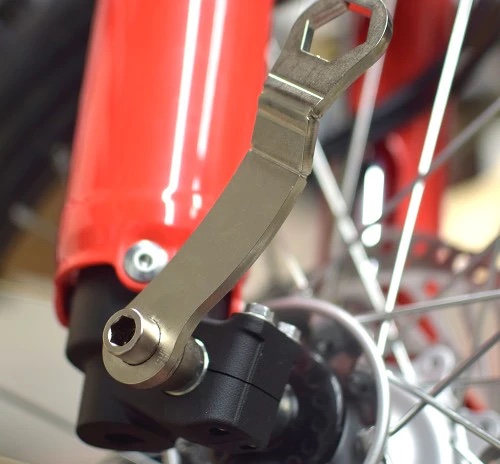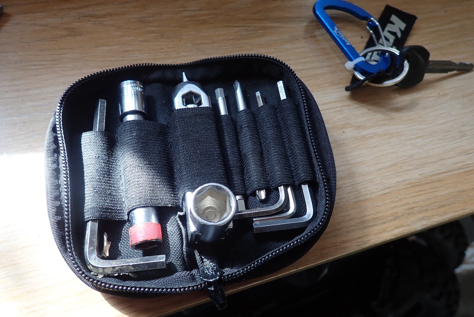The bike’s tool kit sits in a space-wasting plastic box. I’m sure someone could fabricate a more functional replacement or even a 2-litre fuel cell in its place. Once opened I’m even more disappointed than expected: a single fat 14/17 open spanner and a pair of allens, enough to remove the mirrors, seat and side panels. Rally Raid make a nifty combo wrench (left) which does both wheels for under 30 quid, but it’s not in stock. Once I have that alongside my trusty Motion Pro Trail Toolkit with an added 8mm socket and a couple of allens I’ll be good to go.