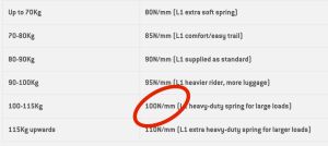 I checked the spring rate on the Rally Raid Stage 1 shock. On top of the spring was marked a surprising and reassuringly firm 100nm which is what it feels like. No wonder the seller found the 300 a bit tippy and decided to sell. I’m tempted to splash out another 200 quid on an HPA (above right) which seems to be a special order from Rally Raid, but am told it may need a change of spring.