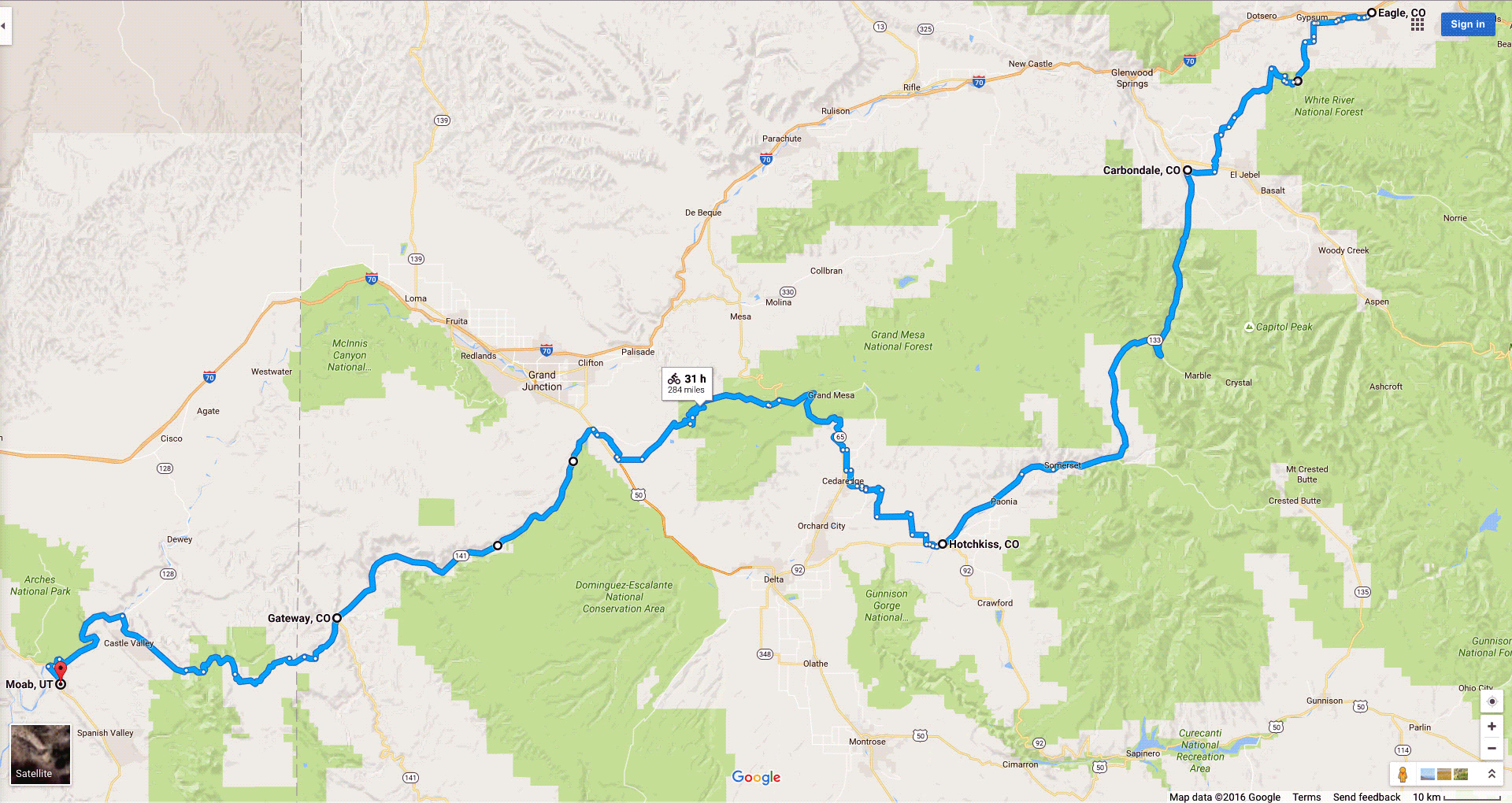 From Eagle, CO I’d pre-mapped a 300-mile network of backroads and trails (above left) towards the La Sal Mountain Loop just out of Moab which I did one brilliant afternoon on the CRF a few years back.