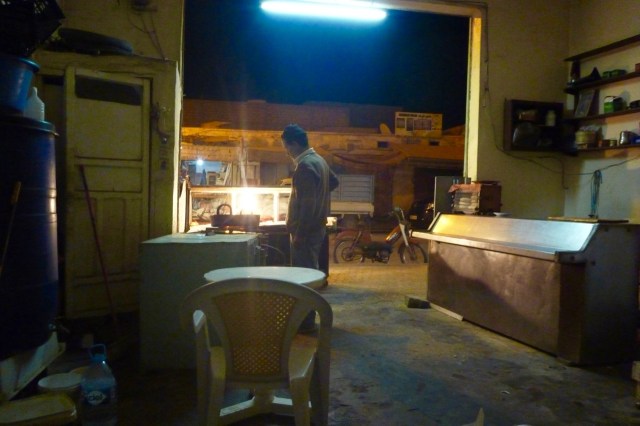 It’s pizza night at the Bab Sahara in Tazenacht! The staff dress up like pantomime gondoliers and Pavarotti booms from the speakers. “Just one Cornetto… Give it to meee”.