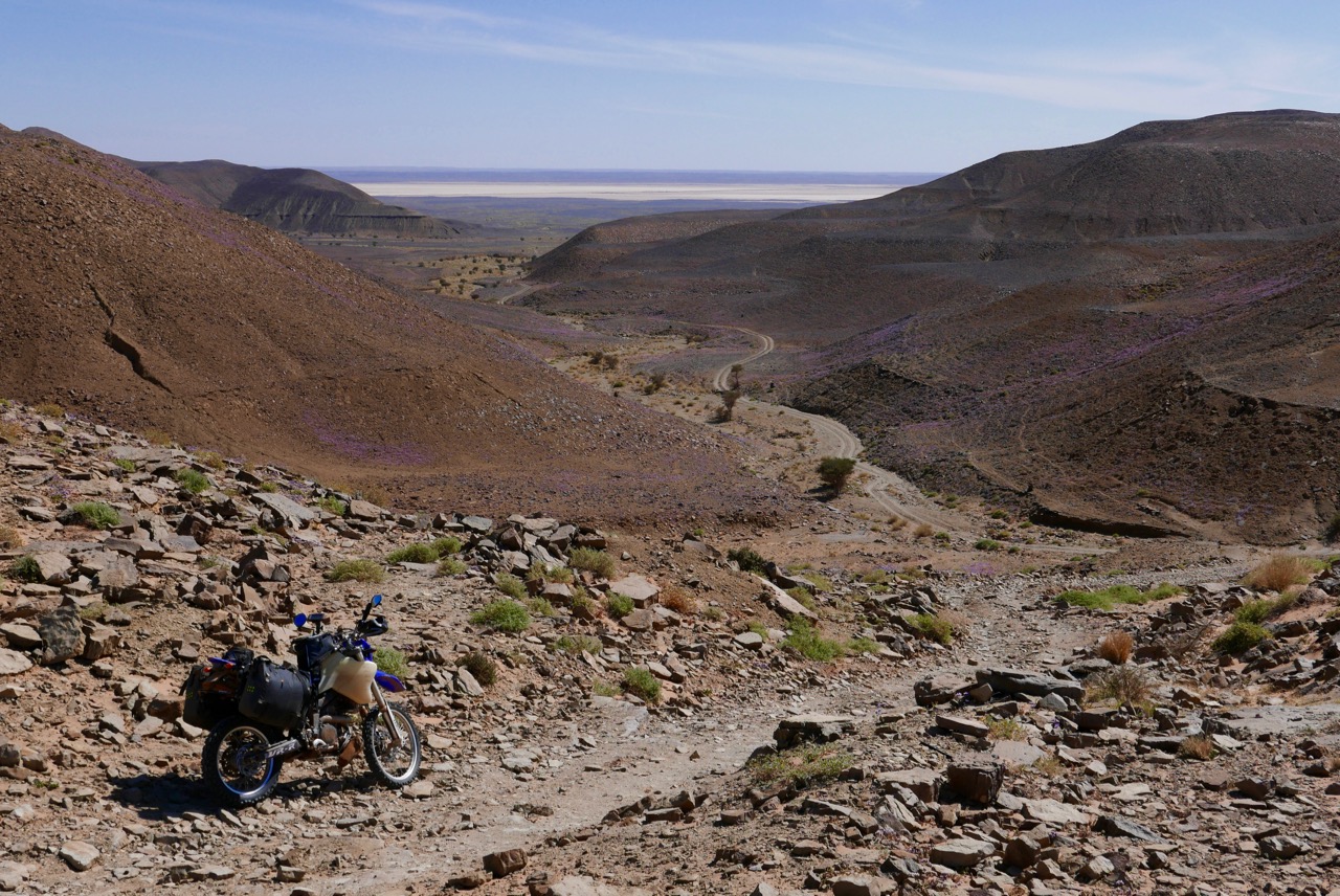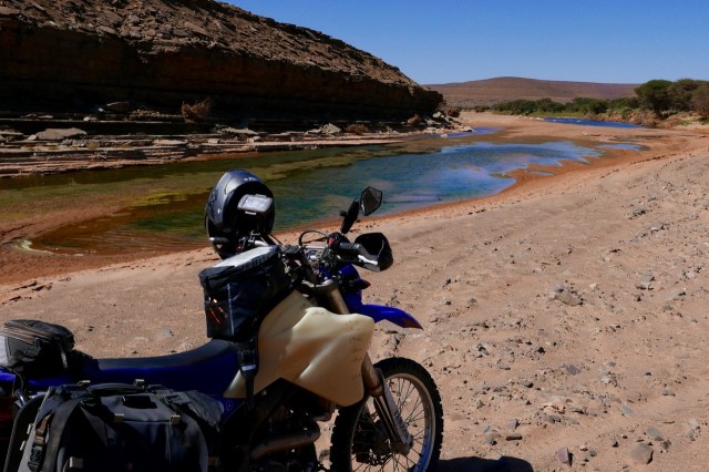 Last time I did this route I met two locals in a VW Golf, but the track is a lot rougher than I remember – a bad sign as it means it’s no longer used by locals. Sure enough I get to the gorge and the track is now a streambed. A fourbie could crawl over this in Low 1st and so could I, but alone, I decide not to risk it. As many of us know well, it takes just one unlucky fall-over to do in a shoulder.