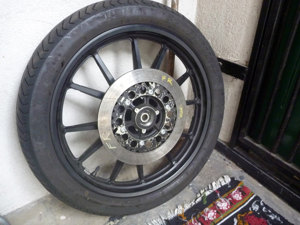 First main job: fit the wheel off a 2016 XVS950R (right). Spindles are the same diameter, but almost certainly new spacers will be needed as well as probable brake caliper spacing to line it up with the V-Max rotor. Luckily the ABS ring may fit – a benefit of using parts from a similar/same era bike. One disc you say? All will be explained.