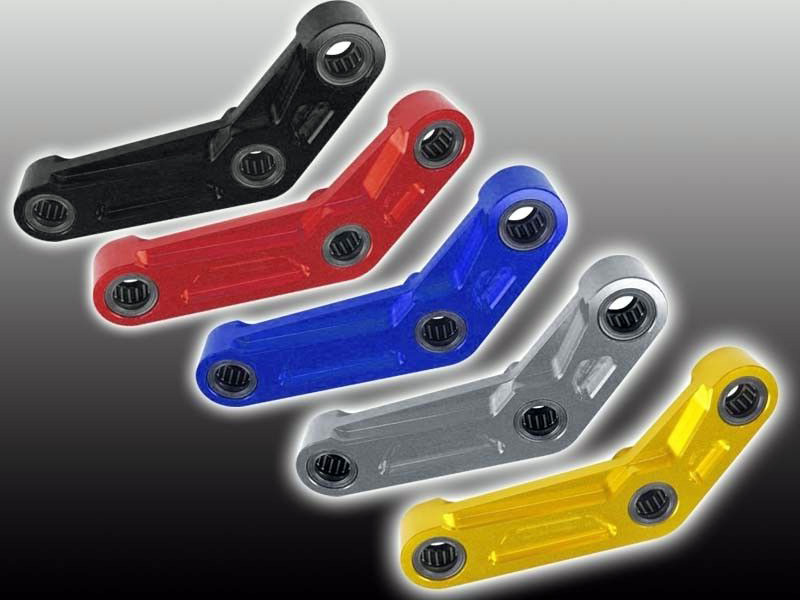 Among others, at the ordering stage only Wilbers offer varying shock lengths to modify standard ride height (most want a lower bike). With other shocks once you’ve spent your £500 you’re stuck with the length. You can get ride-lowering ‘dogbone’ linkages on ebay or, for the 700s, the ‘relay link’ (right) in an array of anodised colours (left). Fitting looks quite a faff and again, like a longer shock, you’re stuck with what you’ve got.