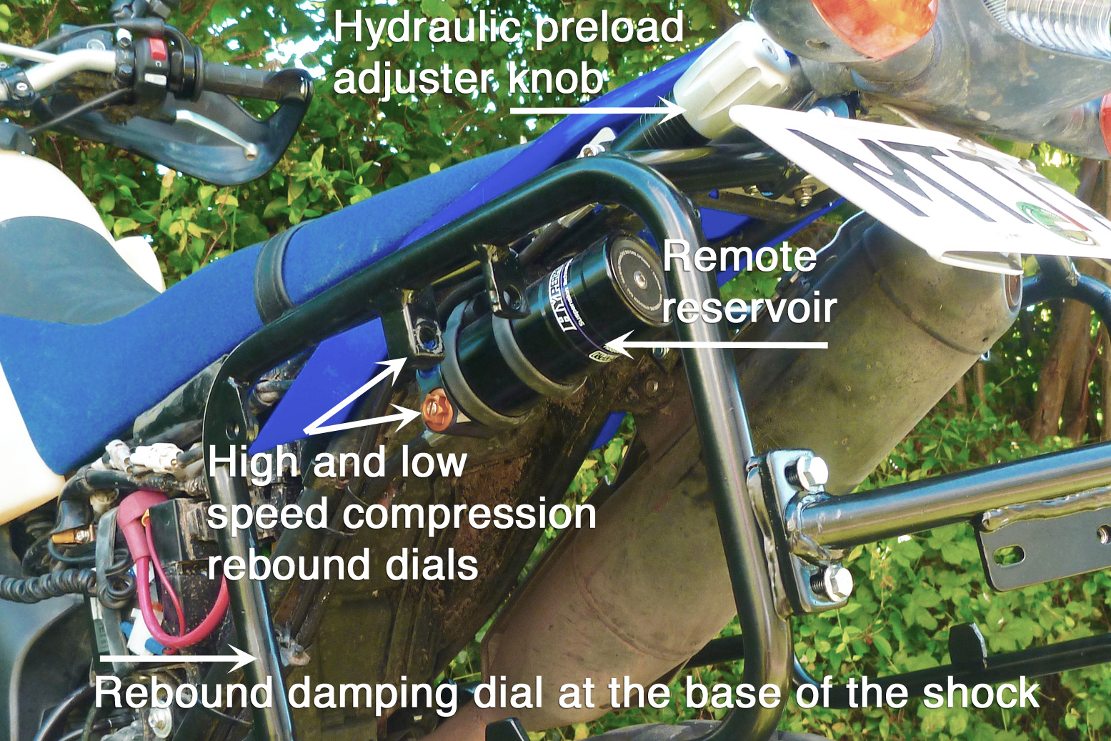The Hyperpro on the WR (right) had rebound damping as well as low- and high-speed compression damping, though adjusting all these permutations, I got in a twist on the last big piste in Morocco while heavily loaded. I think what was actually needed was the maxed-out HPA (hydraulic preload adjuster) collar screwing down the shock body a bit to reset the preload at a higher rate. Turn-knob HPAs are great; give me one of those (or a mechanical version) any day before three types of damping and different coloured springs. An HPA replaces C-spanners and skinned knuckles; when I jacked up my XSR I made sure I wore gloves.