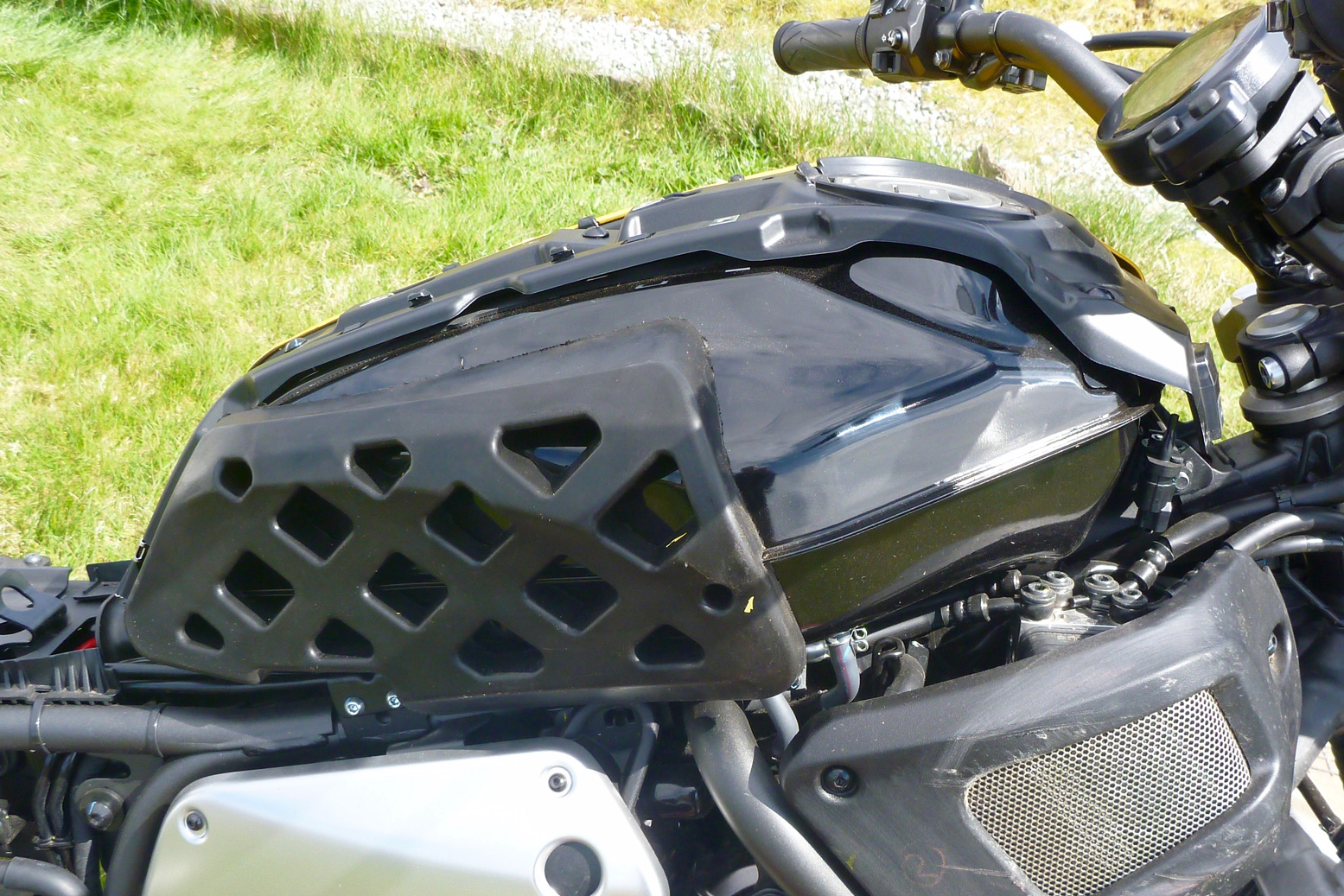 A lack of frame tubes under the engine complicates sump protection, but SW Motech make an alloy spoiler (left; top left; £120). Otherwise I’ve picked up an OE exhaust system which could be extended forward as a sacrificial bashplate to protect the more important sump and exposed oil filter. Doing this will probably lose any height gains from tyre and suspension. And if the OE system gets ruined I have the scratched but fruity Akrapovic which came with the bike. In the end the spoiler never bottomed out and barely scrapped once over a hump, but it fought off showers of stones.