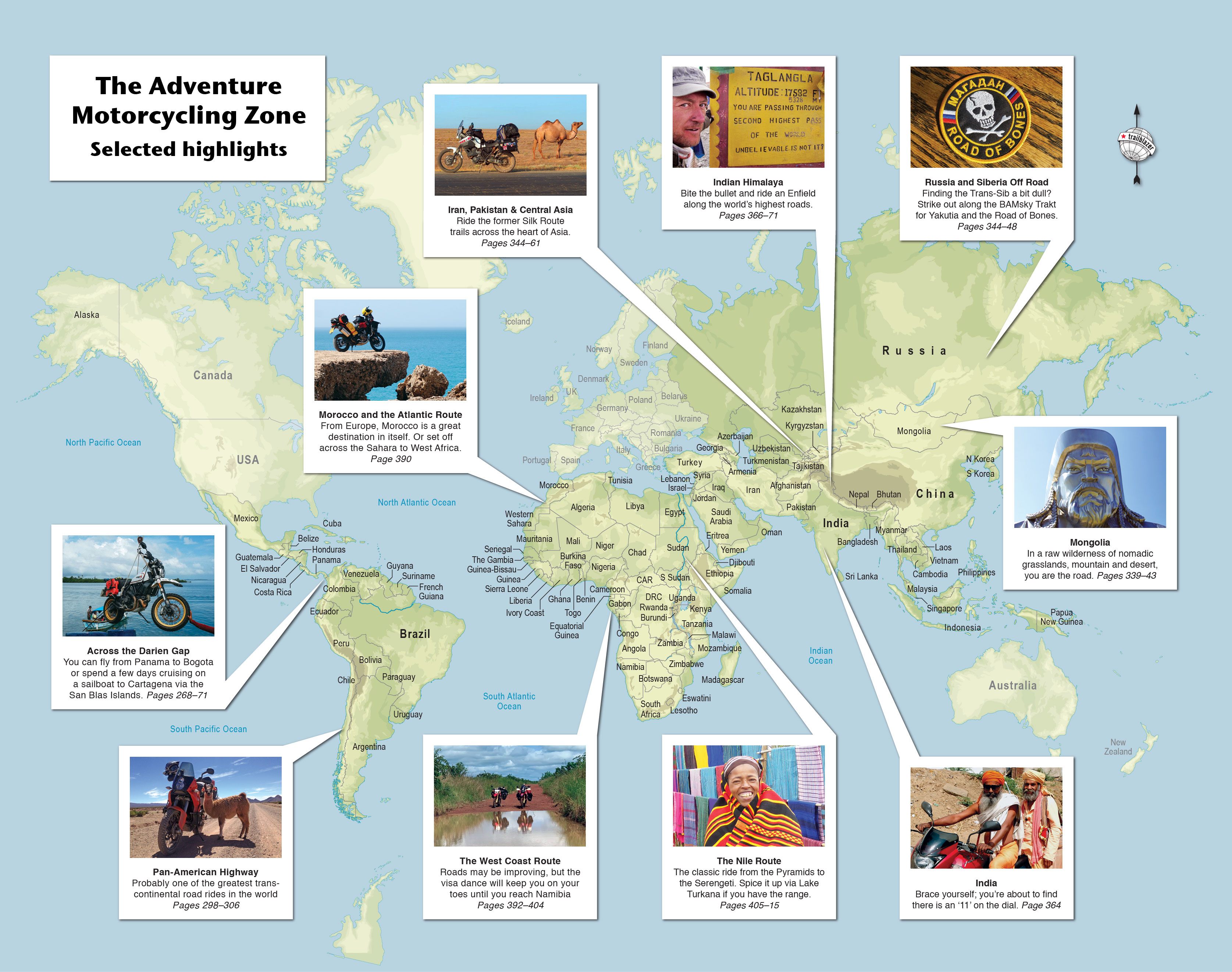 The big image below compares the tread on some of the best-known, currently available do-it-all travel bike tyres. A similar set of images appears in the AMH. Along with price, tread is the first thing we look at when choosing a tyre. This page covers the best 80/20 adventure biking tyres suited to travel in the AMZ where the road infrastructure can be irregular.