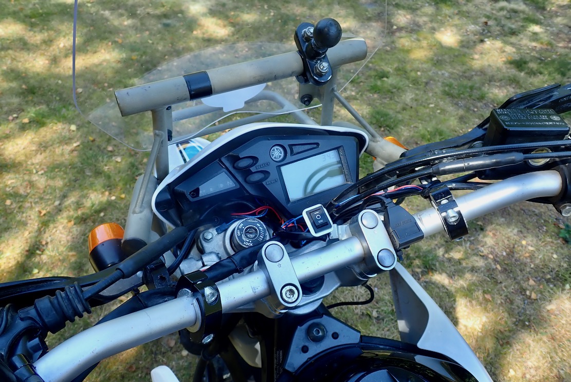 On the back are some slim, 12mm tube side racks which will keep throwovers off the pipe and panels. They’re the sort of thing I’d have got made. I’m sure I’ll find a use for the alloy tail rack too. The previous owner also fitted heated grips (shorted out right now), Acerbis hard guards, a USB socket and some 1-inch risers which are nearly enough for me, but probably all the cables have to give.